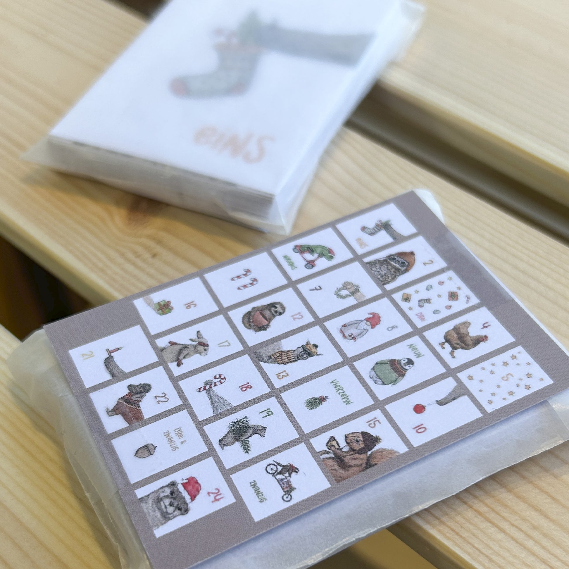 24 Mini Karten mit Zahlen und weihnachtlichen Motiven, perfekt für einen selbst gemachten Adventskalender.