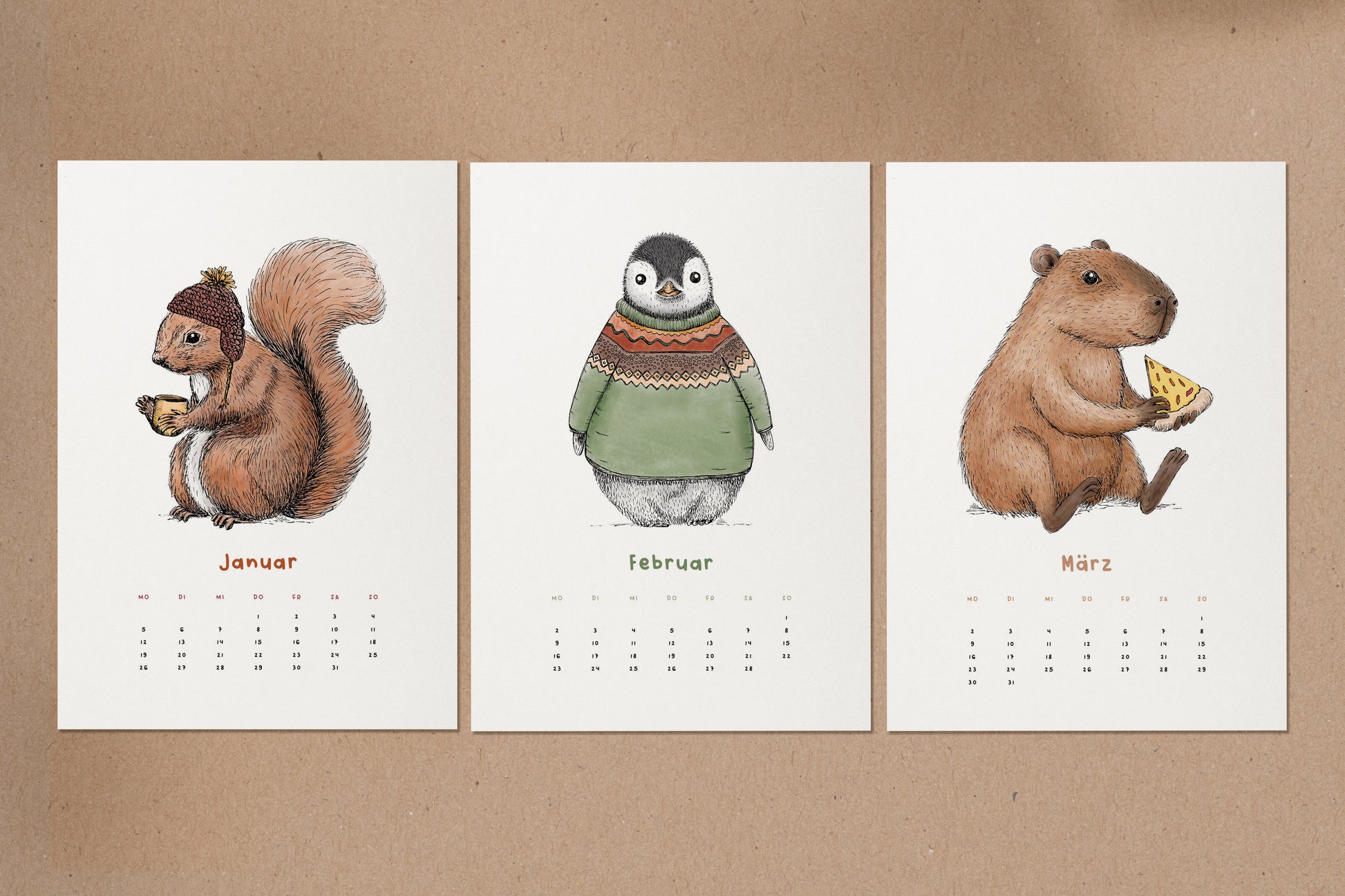 1 Titelblatt, 12 Kalenderblätter in DIN A4 aus 300g Naturpapier werden mit einem Klemmbrett zusammen gehalten. Der Kalender kann sowohl aufgehängt oder hingestellt werden.